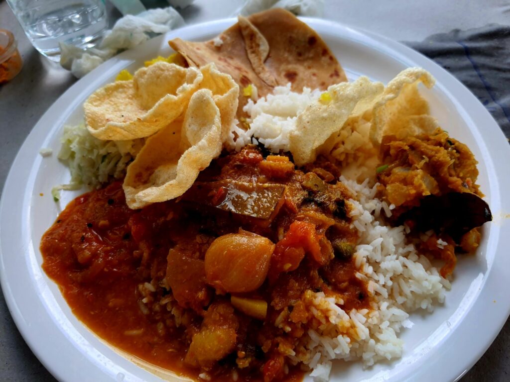 Rice, vegetables, curries, sambar, rasam, sides — everything you expect.