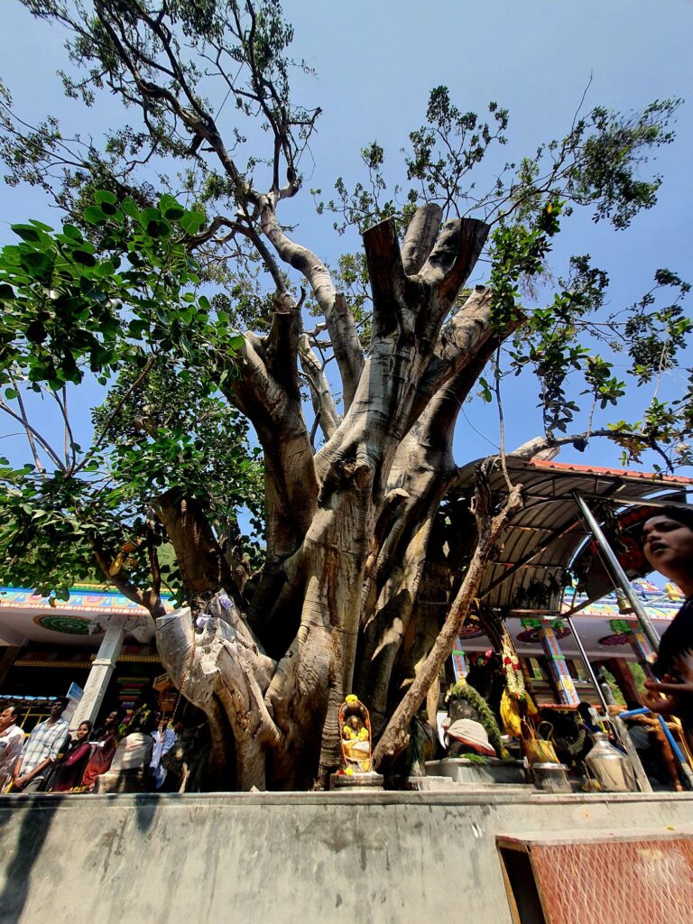 I sat on the cemented floor inside the temple complex, under a peepal tree with many small idols placed beneath it.